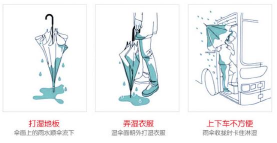 傳統的雨(yǔ)傘(sǎn),濕掉的傘麵在外側,進入室內後,濕的傘麵(miàn)會將室內地 板打濕;傘麵挨著衣服也會將衣服打濕;上下車門時,傳統雨傘是(shì)向 內收攏的,會卡住卡門,把雨水濺到衣服上淋濕,不方便又很惱人。