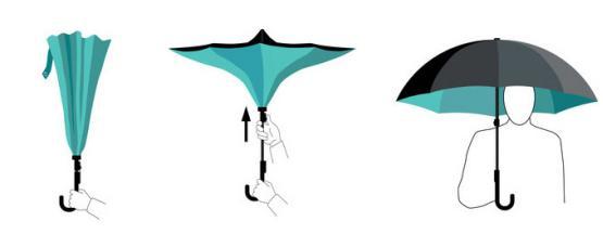 它顛覆了傳統的雨傘,傘骨居然是反(fǎn)向的,撐起來大概就是這個樣子。