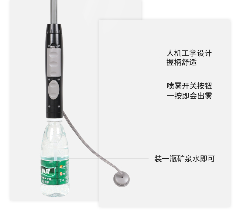 大家也許會有疑問,噴霧的雨傘,霧(wù)是從哪裏來的呢?看圖,外接一瓶礦泉水的助力(lì),傘手柄的位置,需要擰(nǐng)上一瓶水,用標(biāo)準的礦泉水瓶就行,接在遮陽(yáng)傘把的末端,按噴霧開關,裏麵的吸管(guǎn)就能從中吸水,霧化之後在頭頂(dǐng)噴出(chū)來~