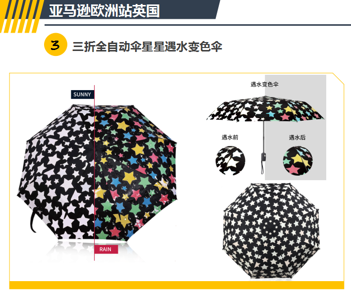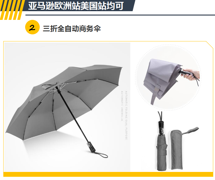 折疊(dié)傘(sǎn)中又(yòu)細分三折傘(sǎn)、五(wǔ)折傘、手開(kāi)傘、自開收傘等。最受大眾歡迎的就是三折傘了,而作(zuò)為跨境電商一般銷量最好的(de)也是三折自開收傘。